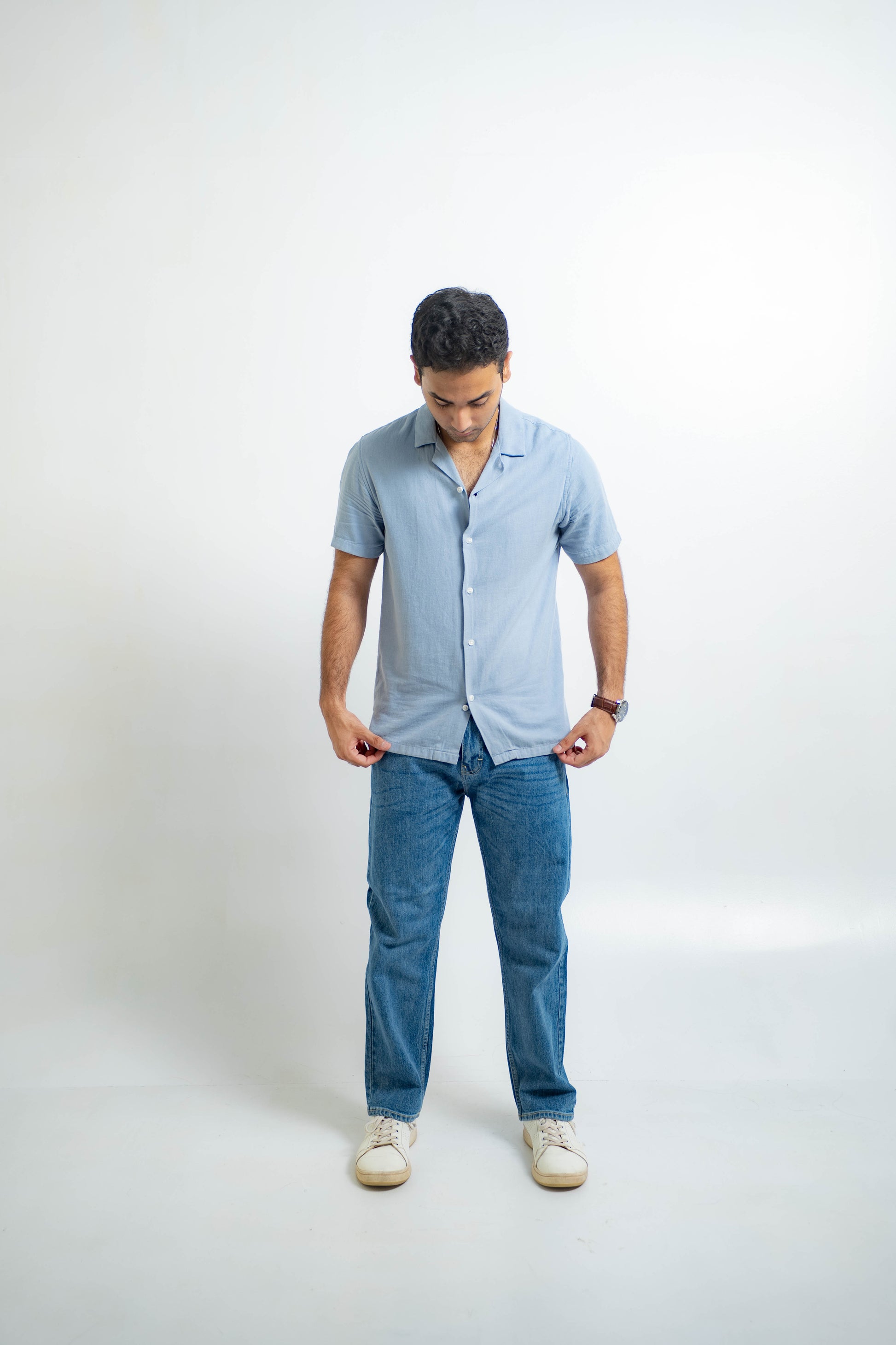 • Dark blue crosshatch-washed denim